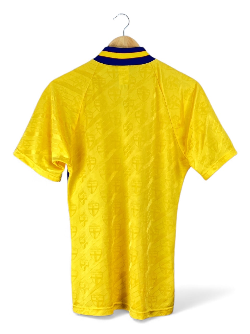 Maillot domicile de la Suède utilisé lors des saisons 1994-95 et 1995-96, notamment durant la World Cup 94 aux États-Unis (3e place). Première apparition lors de Suède-Nigéria (3-1, amical) le 05/05/1994 à Solna.
