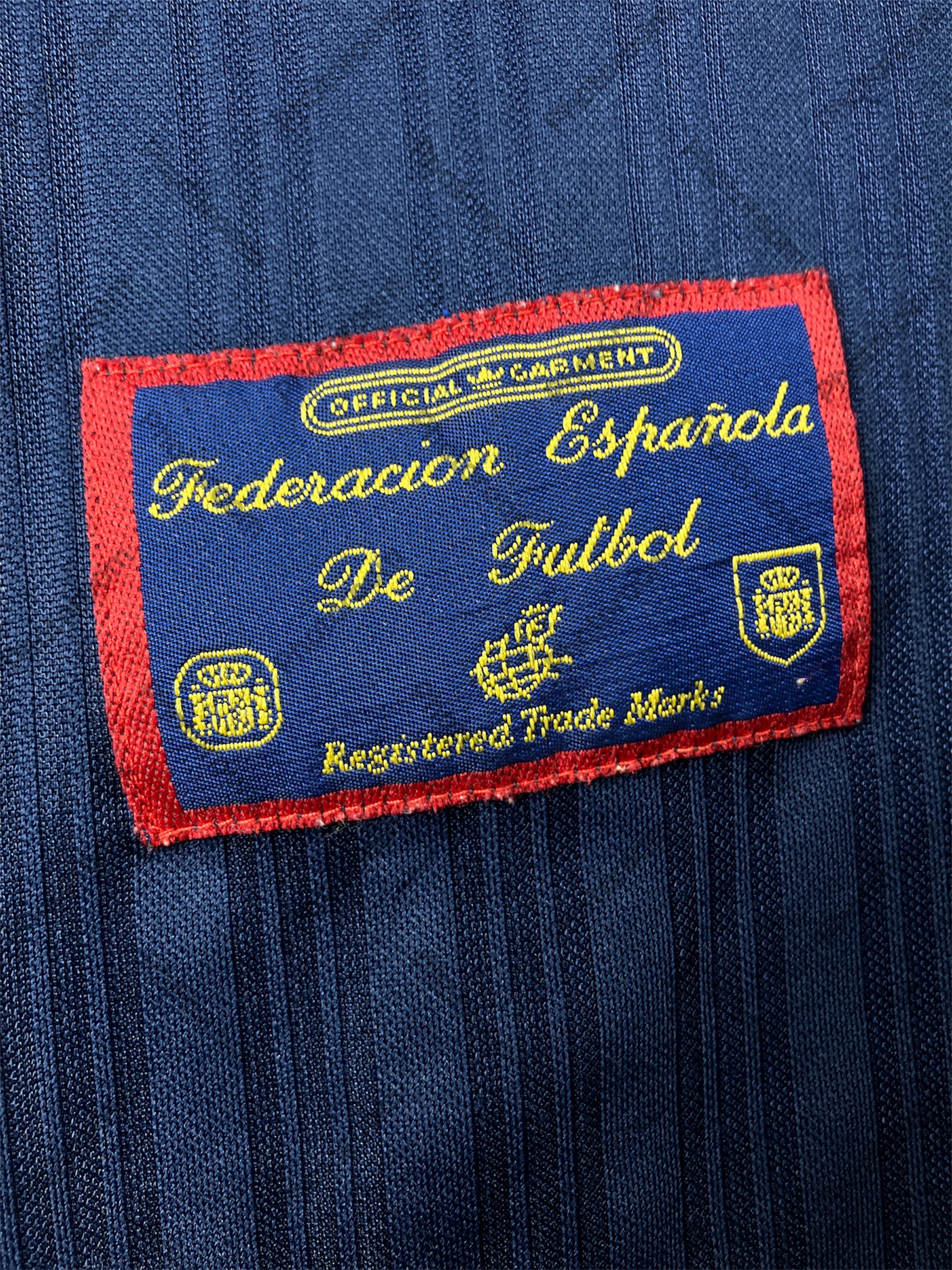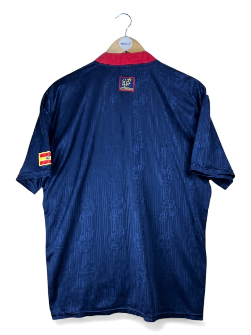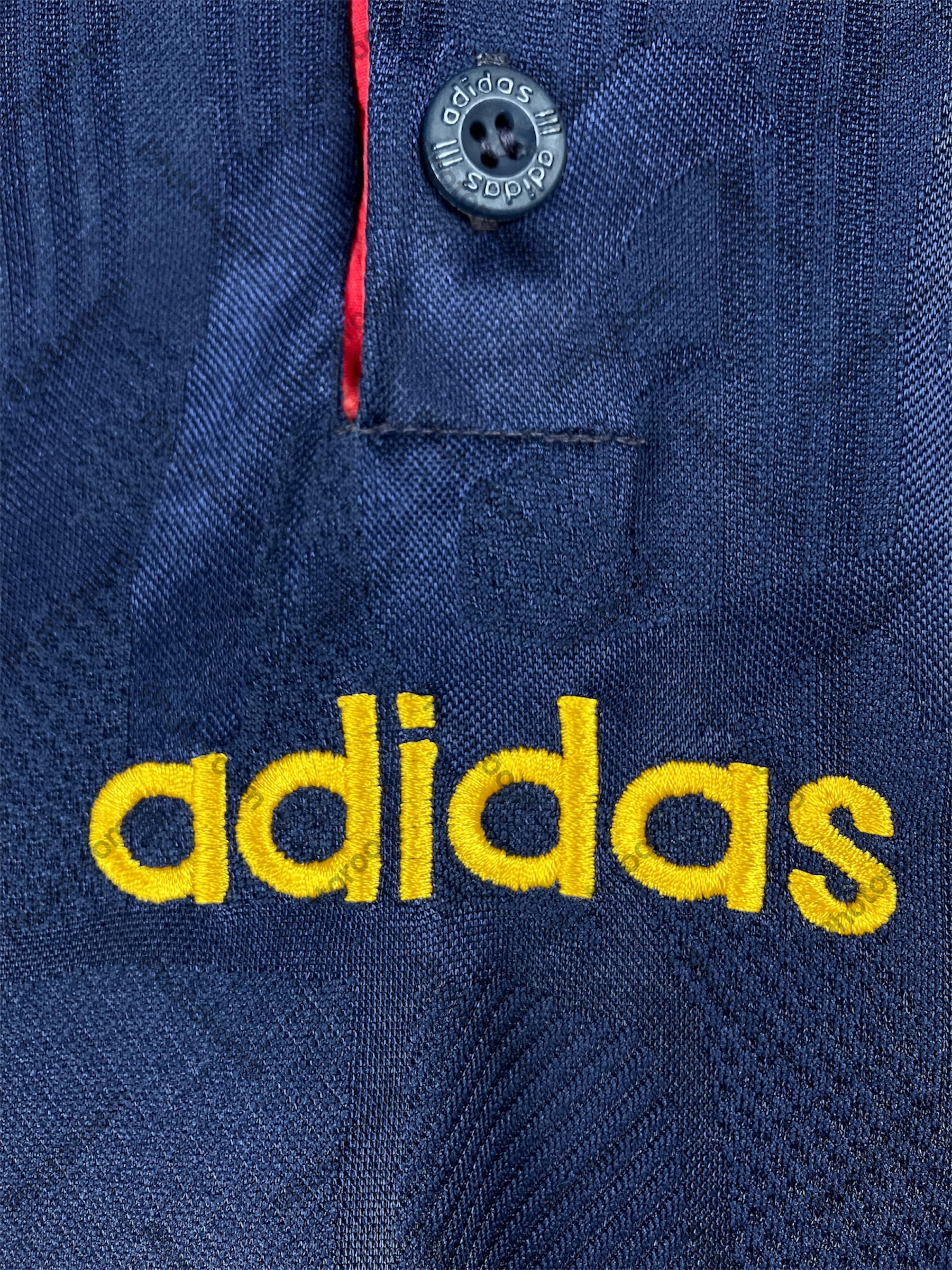 Maillot extérieur de l’Espagne utilisé lors de la saison 1996-97 et notamment durant l’Euro96 en Angleterre. Première apparition lors de Norvège-Espagne (0-0, amical) le 24/04/1996 à Oslo.
