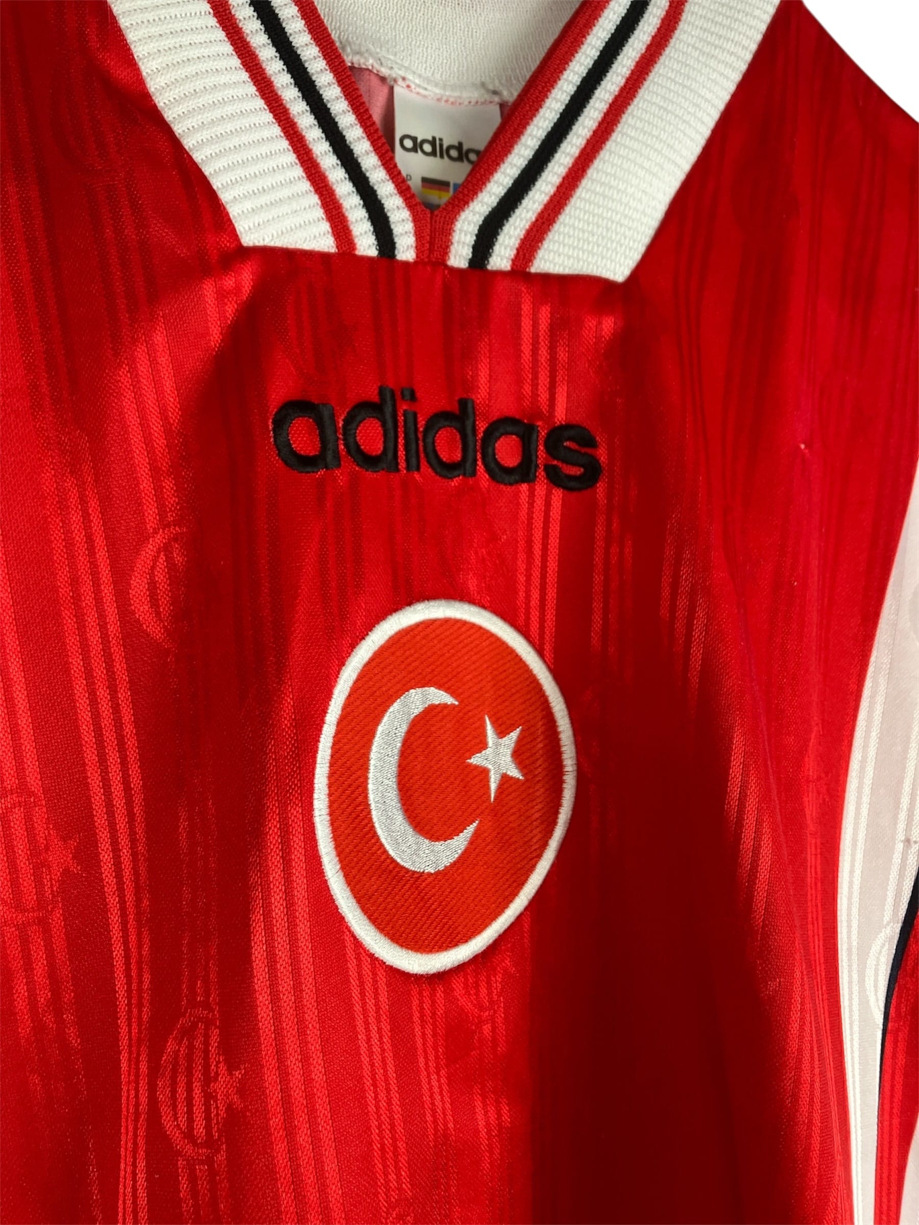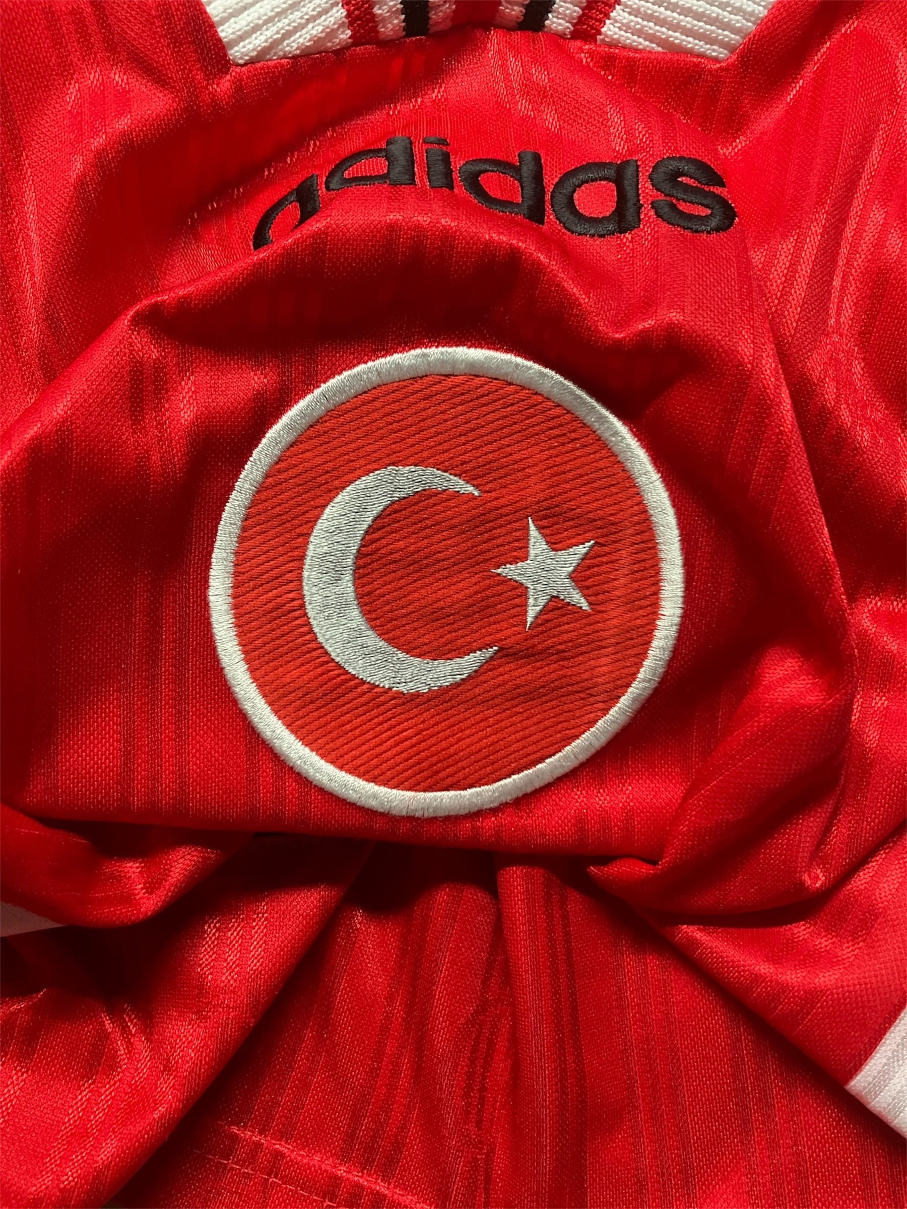 Maillot domicile de la Turquie utilisé lors de la saison 1996-97 et notamment durant l’Euro 96 en Angleterre. Première apparition lors de Estonie-Turquie (0-0, amical) le 29/05/1996 à Tallinn.