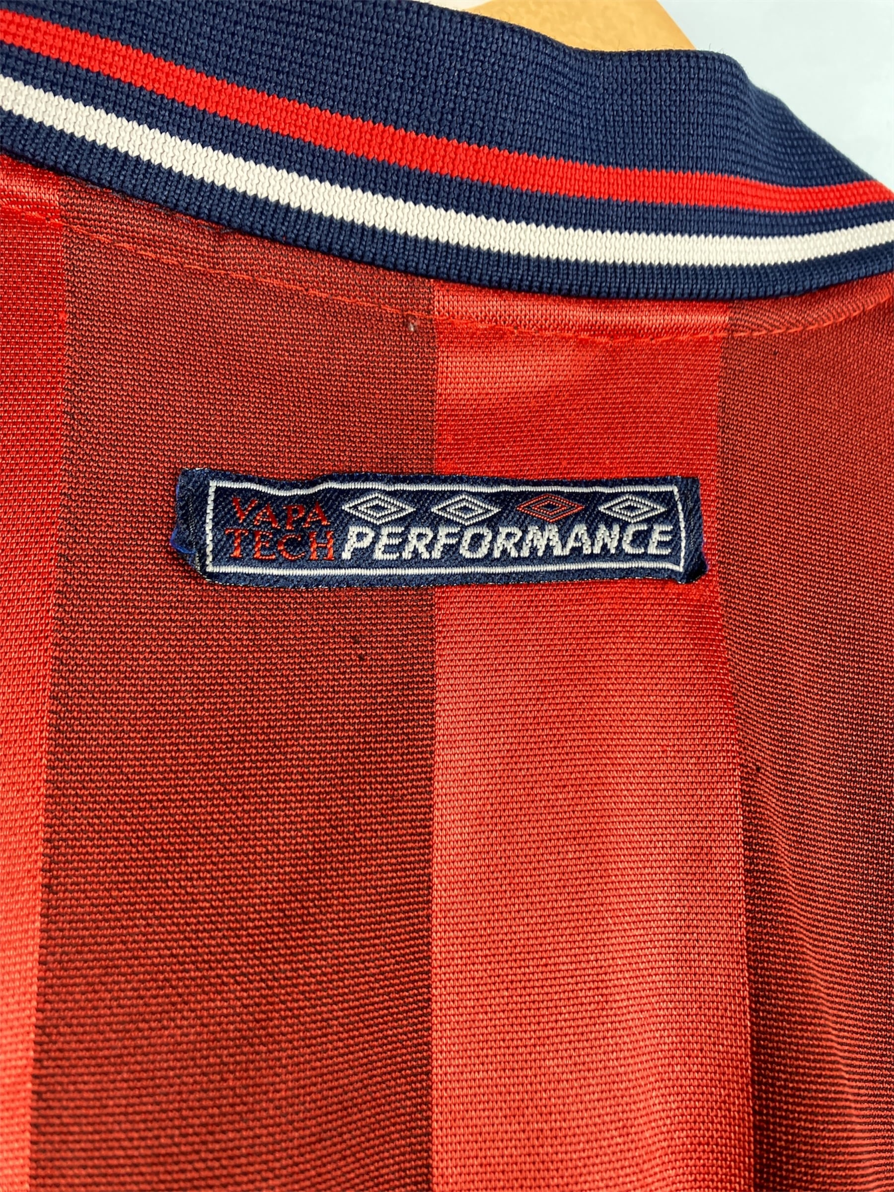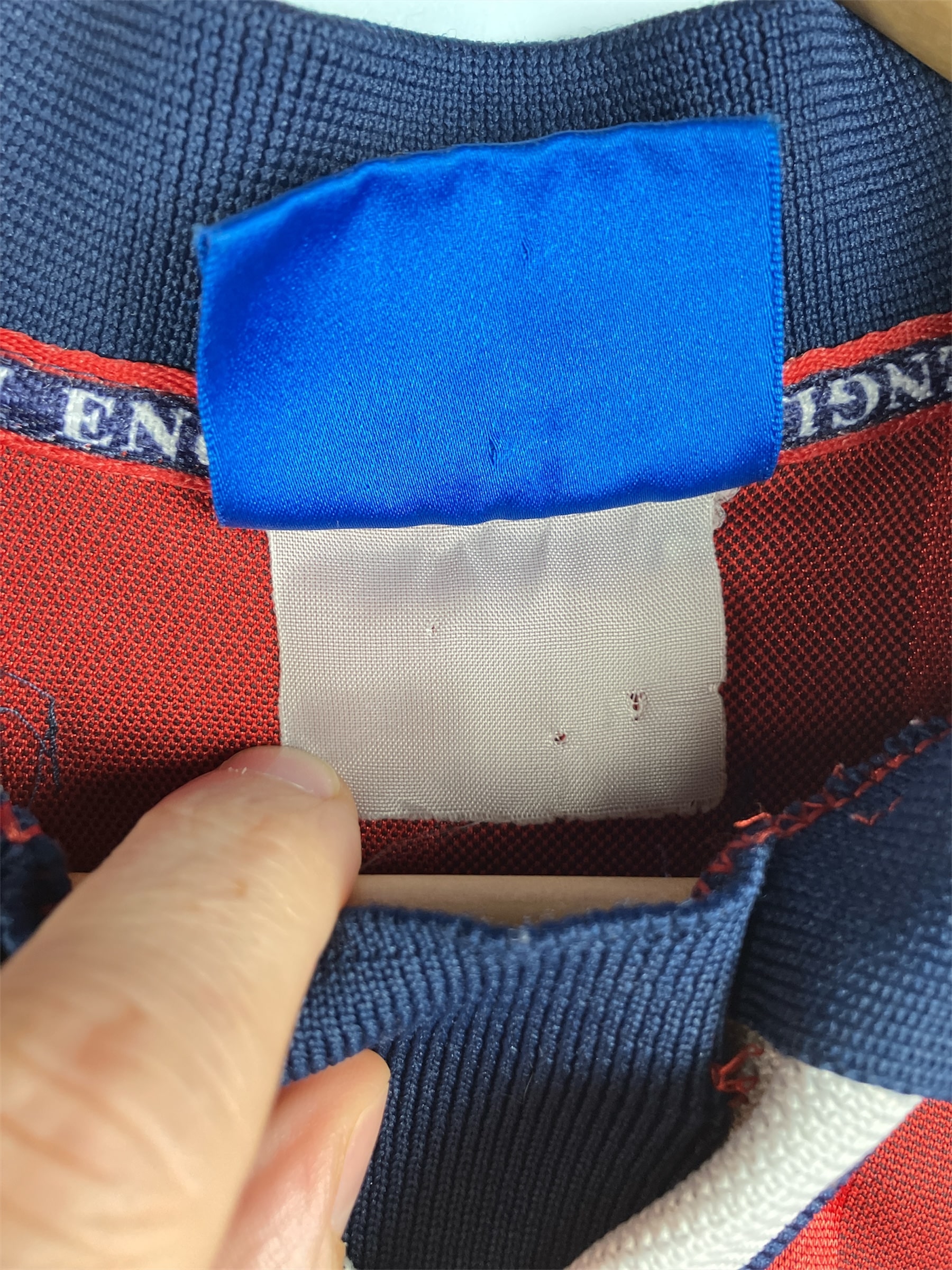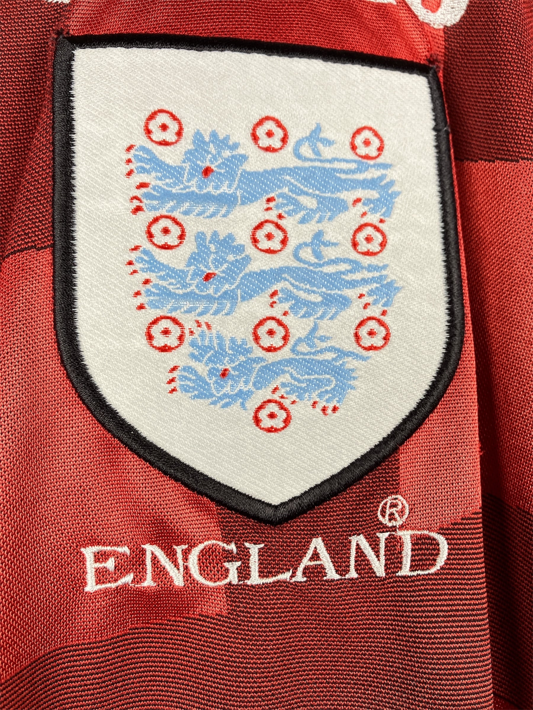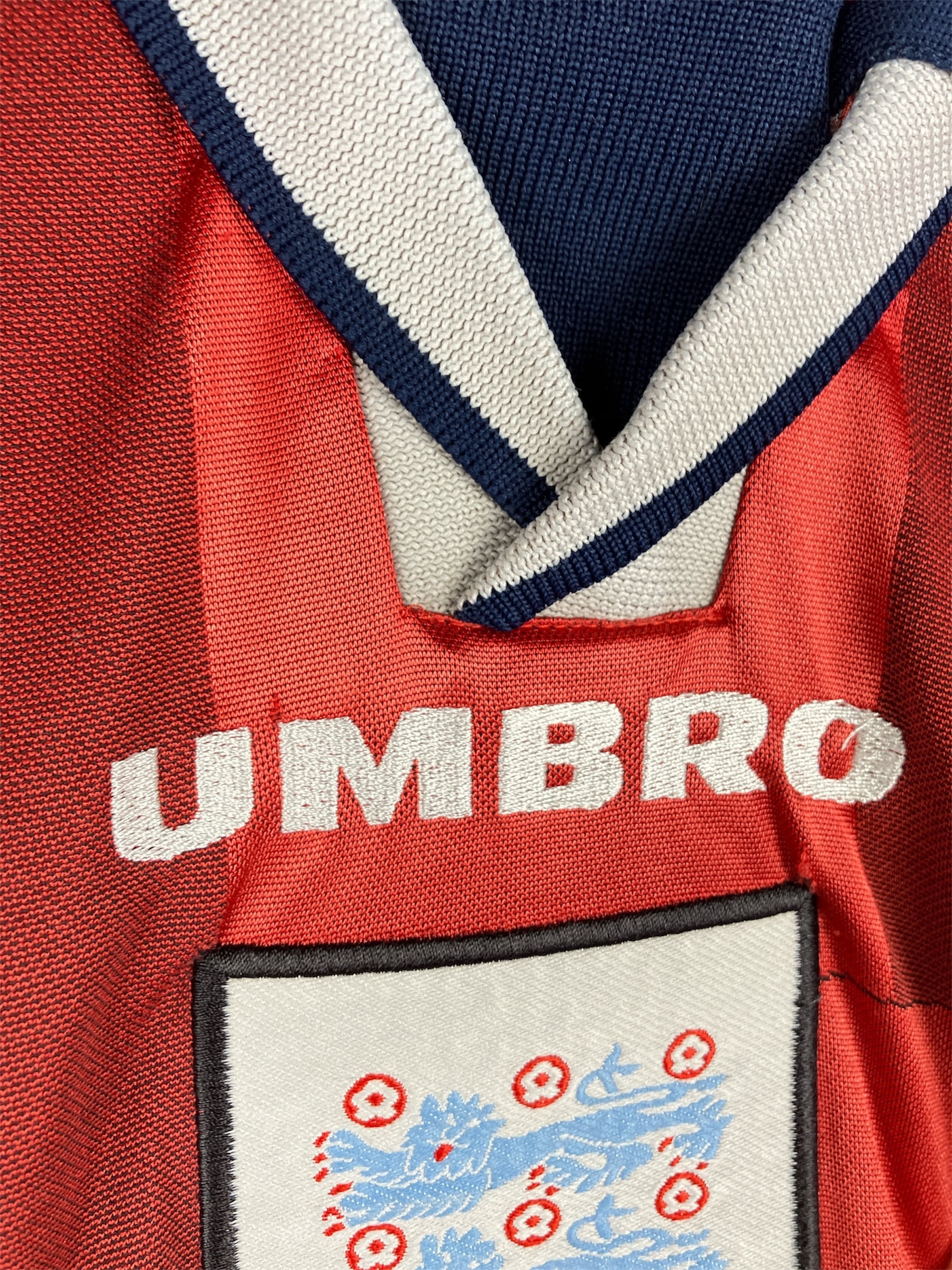 Maillot extérieur de l’Angleterre utilisé lors des saisons 1997-98 et 1998-99 (seulement 1 match), notamment pour la Coupe du monde 1998 en France. Première apparition lors de Brésil-Angleterre (1-0, Tournoi de France) le 10/06/1997 à Paris.