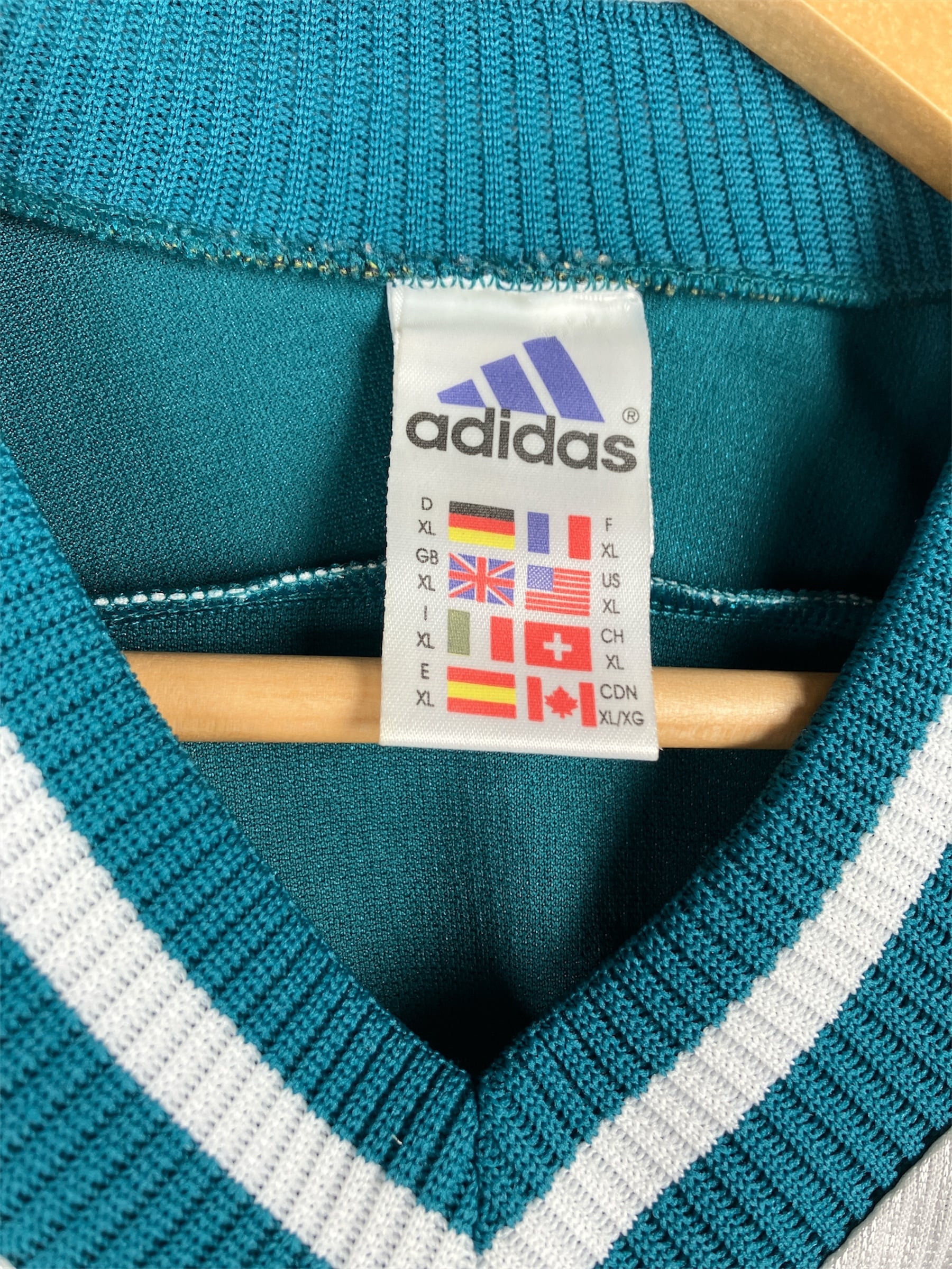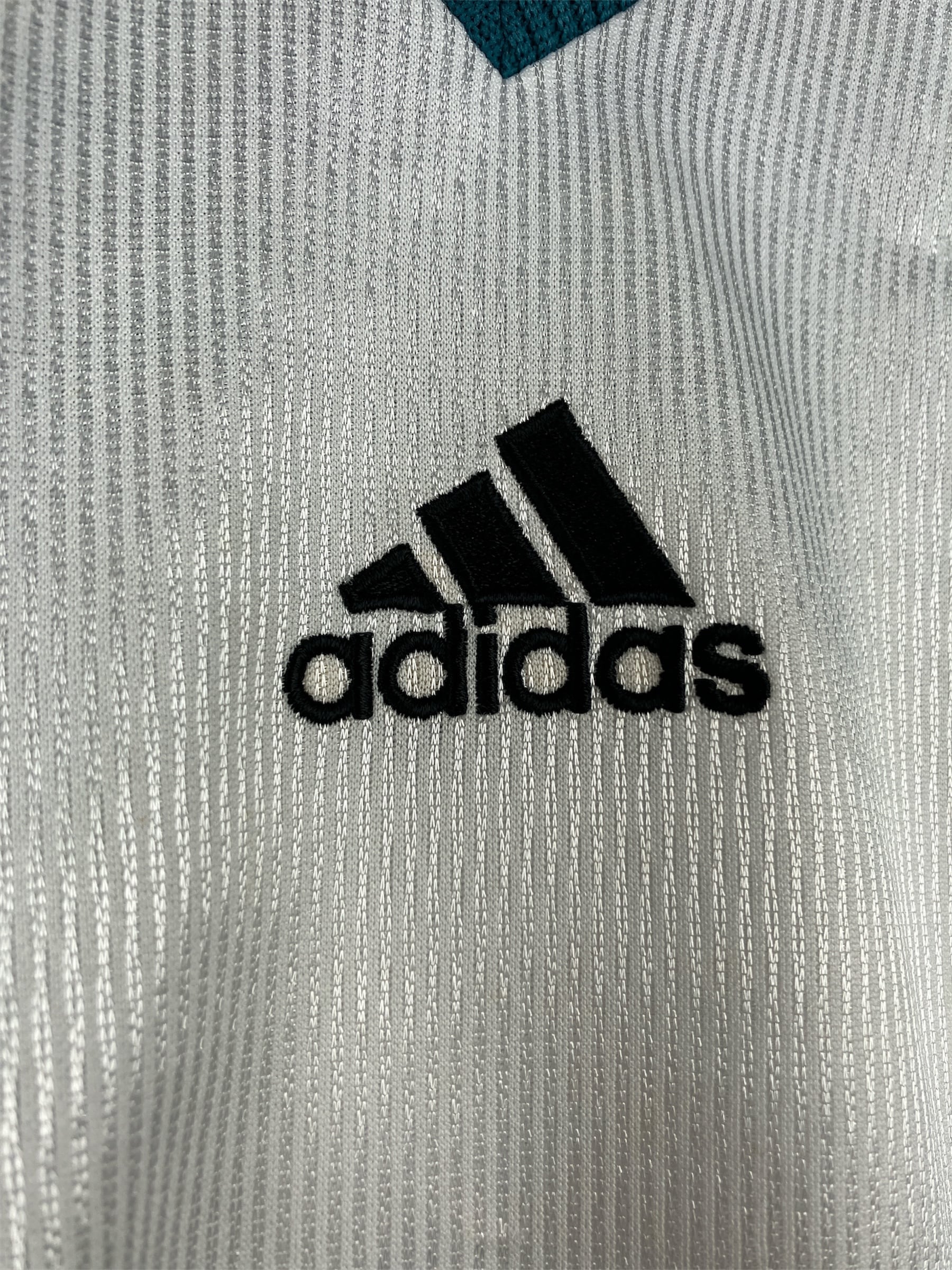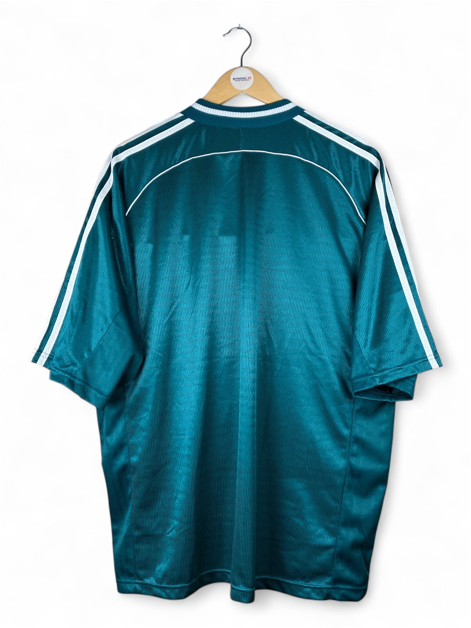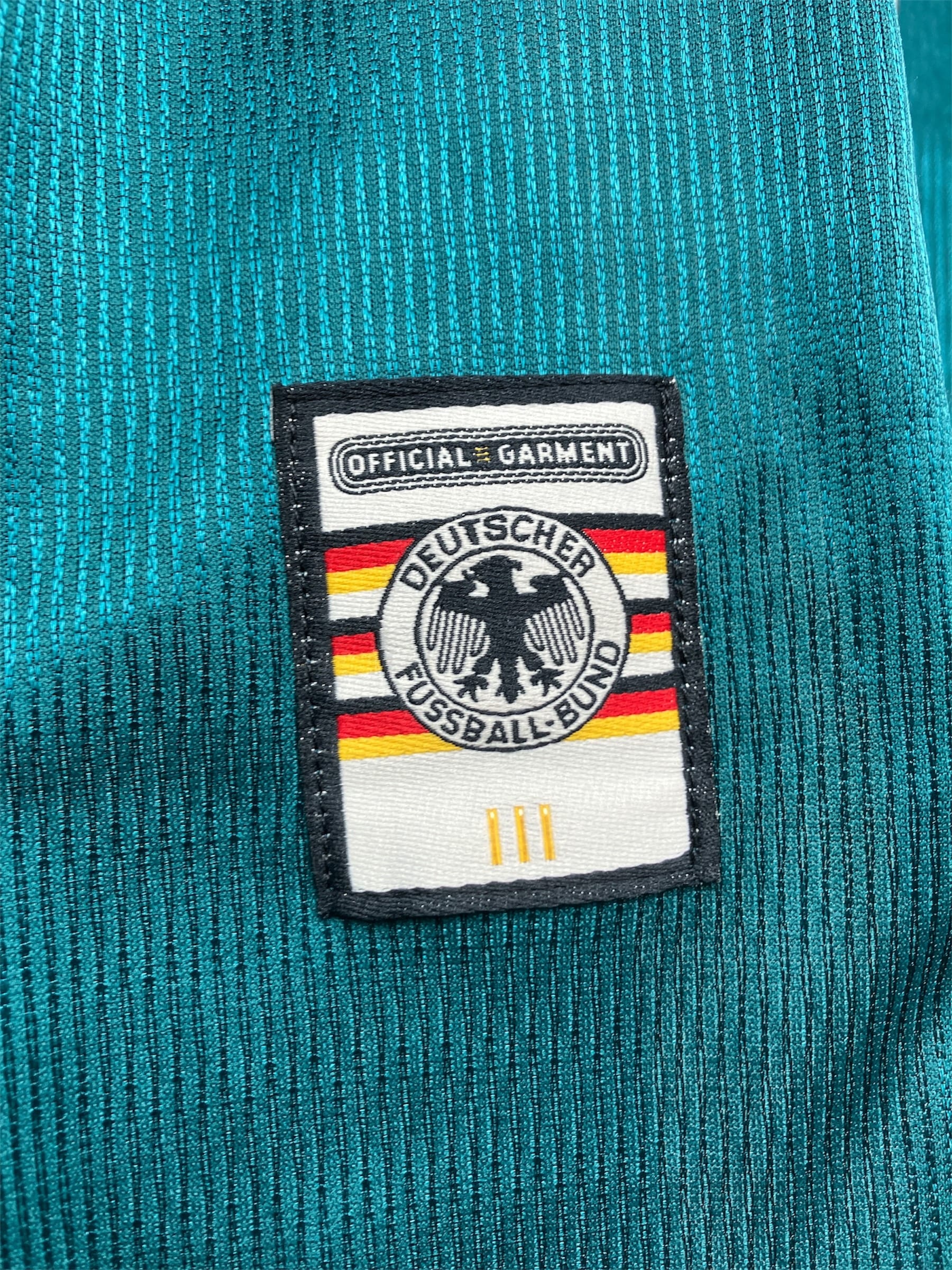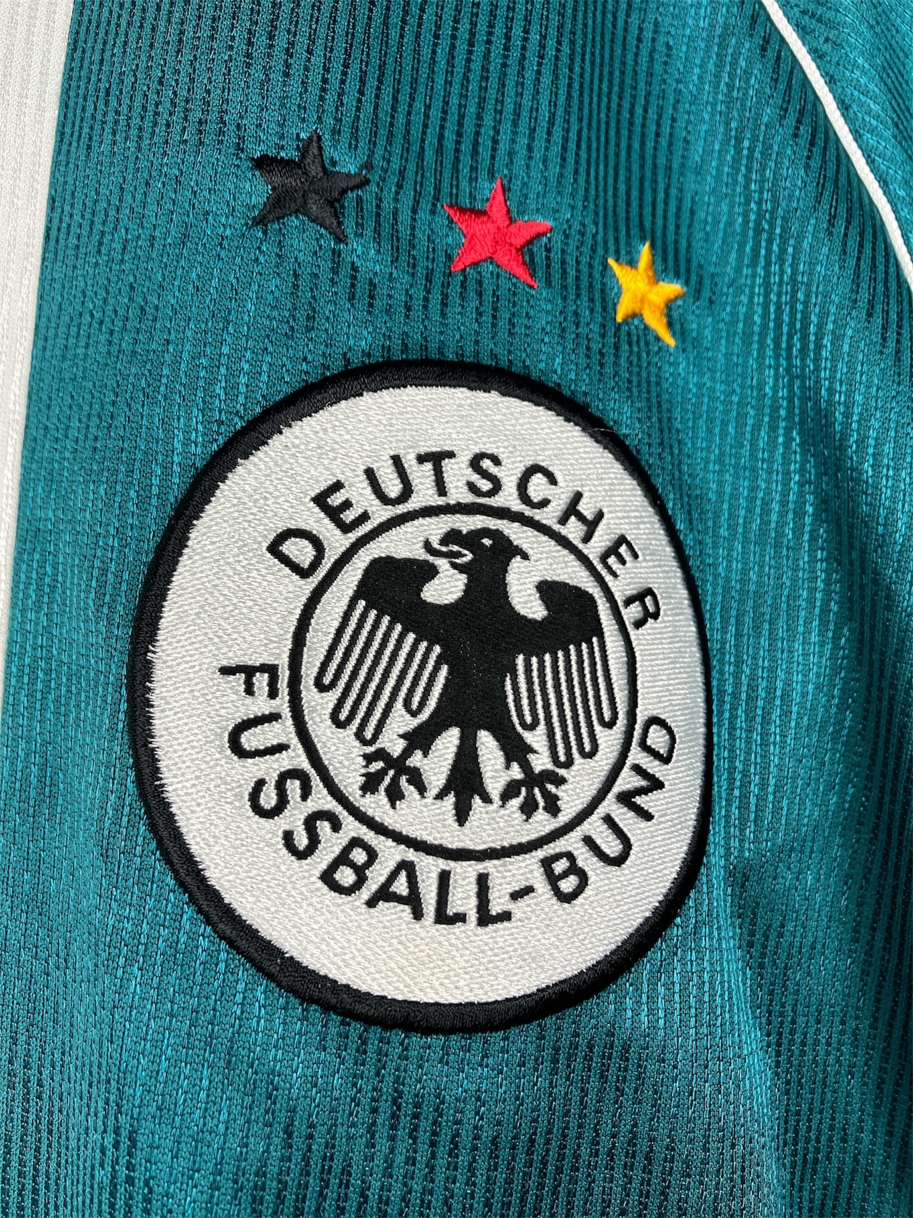 Maillot domicile de l’Allemagne utilisé lors de la saison 1998-99, notamment durant la Coupe du Monde 1998 en France. Première apparition lors de Finlande-Allemagne (0-0, Amical), le 27/05/1998 à Helsinki.