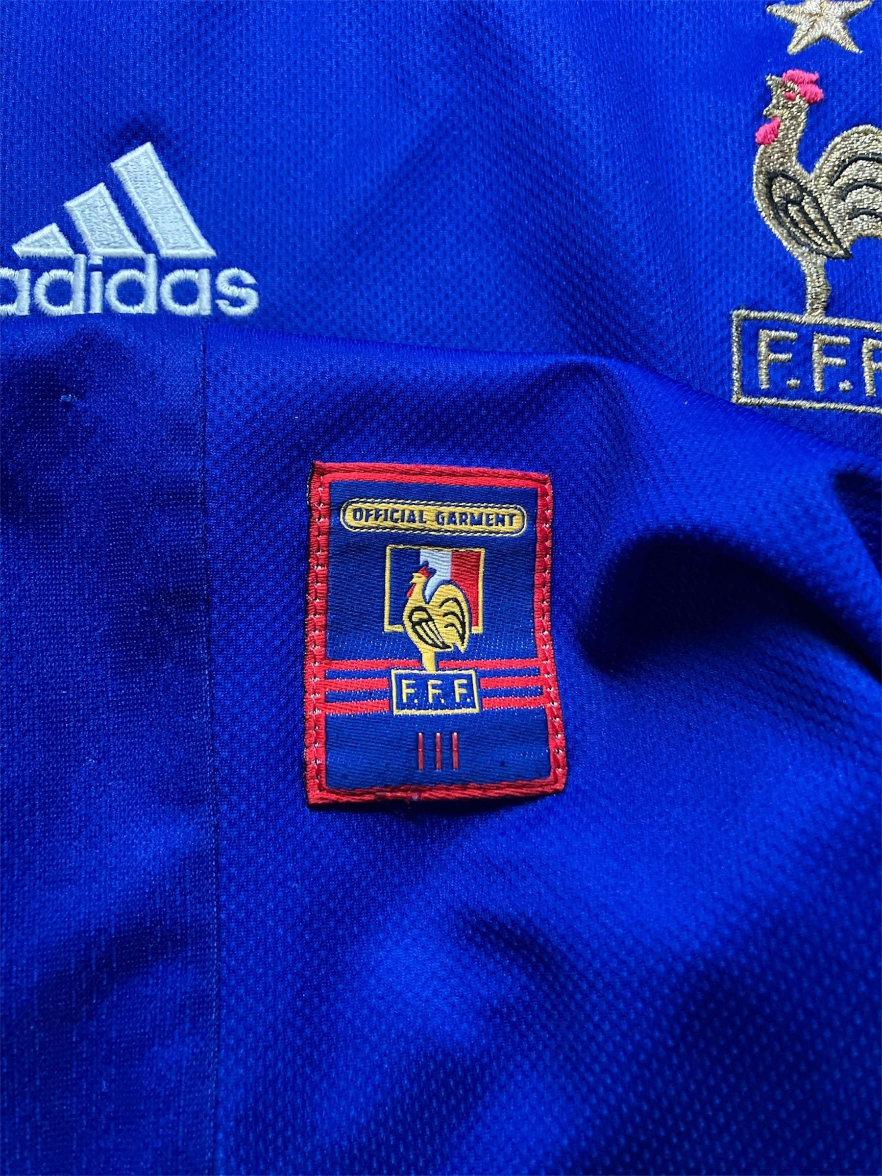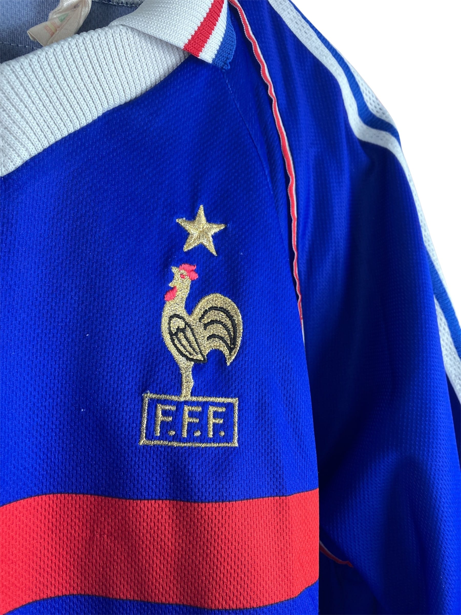 Maillot domicile de la France utilisé lors de la saison 1998-99 et notamment durant la Coupe du monde 1998 à domicile. Première apparition lors de France-Espagne (1-0, amical pour l’inauguration du Stade de France) le 28/01/1998 à Saint-Denis.